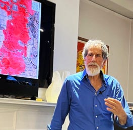 The host, Paul, introduced Ascherman. There was a simultaneous Zoom of the event underway, and a map projected on a screen, where a nine-minute video, “A Protective Presence,” was shown. The land illustration documented areas where the Palestinian communities were, overlapped by outposts, settlements, and complete zones controlled by settlers.